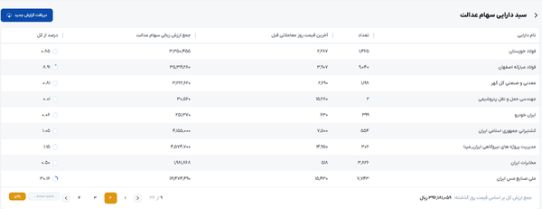 در حال حاضر ارزش روز سهام عدالت امروز به مبلغ ۳۹۶ میلیون و ۱۸۱ هزار و ۵۹ ریال رسیده است.
